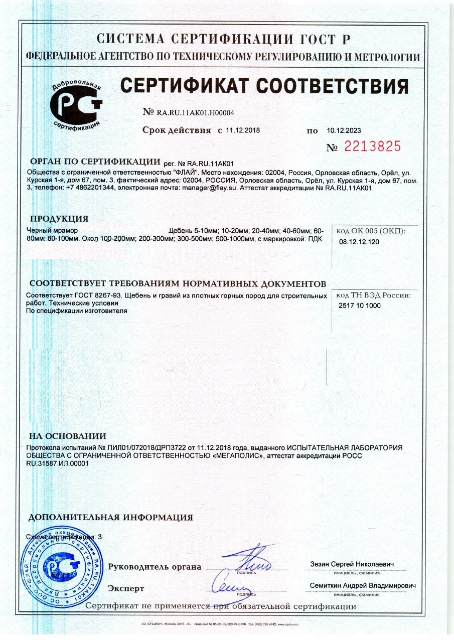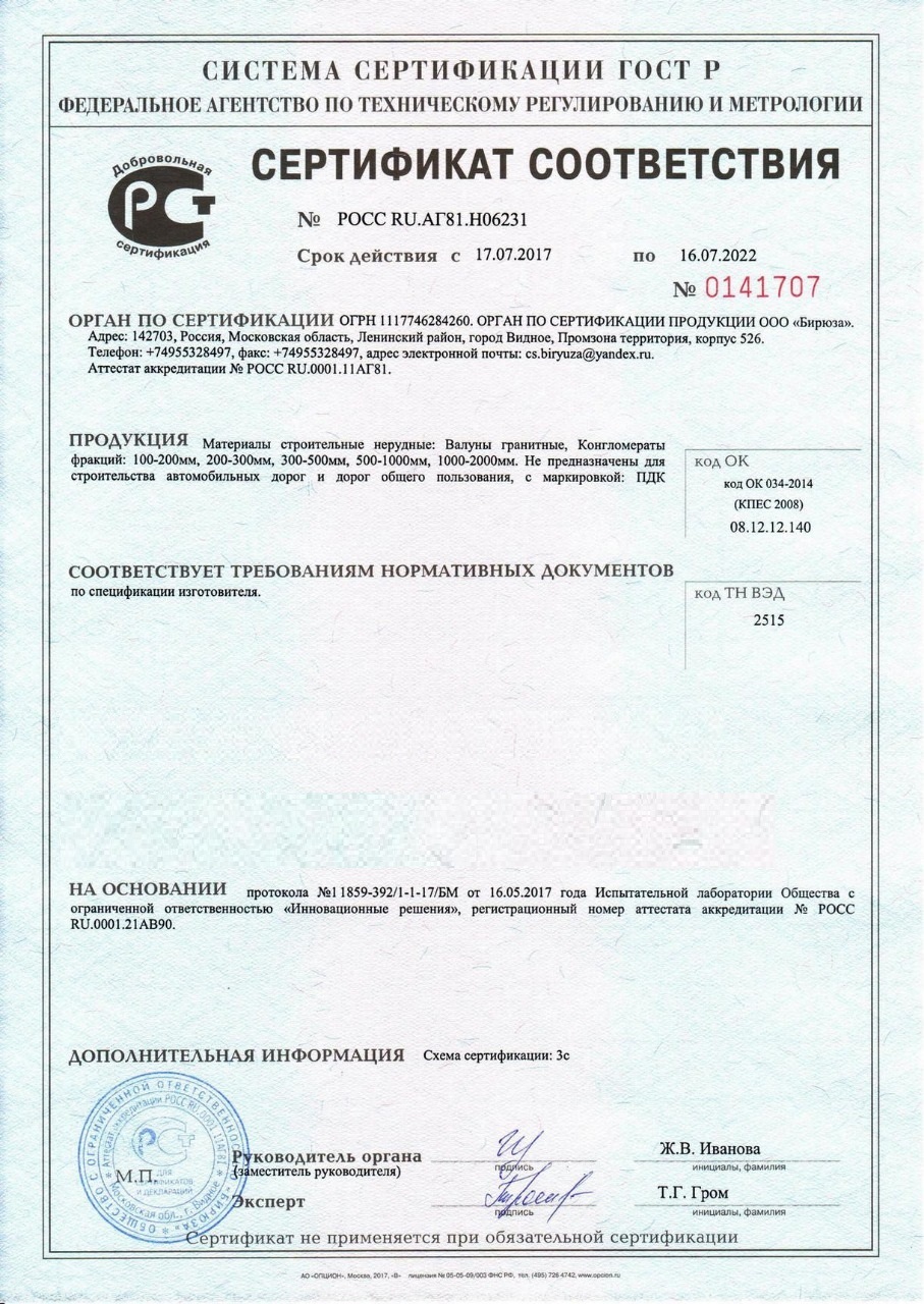 Сертификат соответствия – документ, подтверждающий соответствие продукции требованиям качества и безопасности, установленными для нее действующими стандартами и правилами. Наш камень, который Вы сможете заказать с доставкой в Тюмени , обладает всеми необходимыми документами для реализации и при необходимости могут быть предоставлены все необходимые подтверждающие документы при поставке.